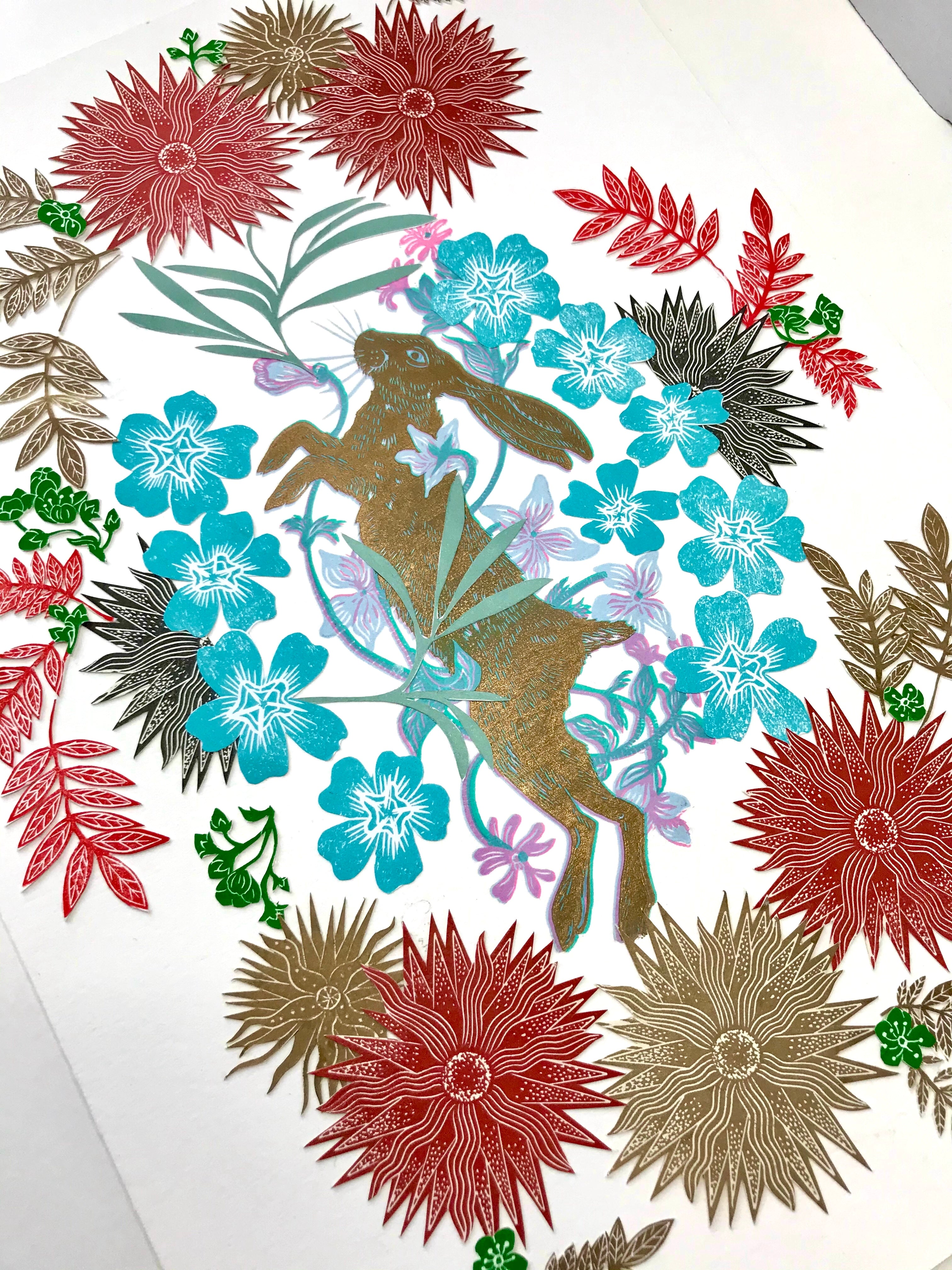 The main inspiration for the design came from my collages. The Spring Hare design was created from cutting out linoprints and creating a composition of florals and comets. A barn owl and running hare also feature from a collage, along with my Firework of Ferns gold linoprint, featuring curled fern heads and a moth amongst the stars.