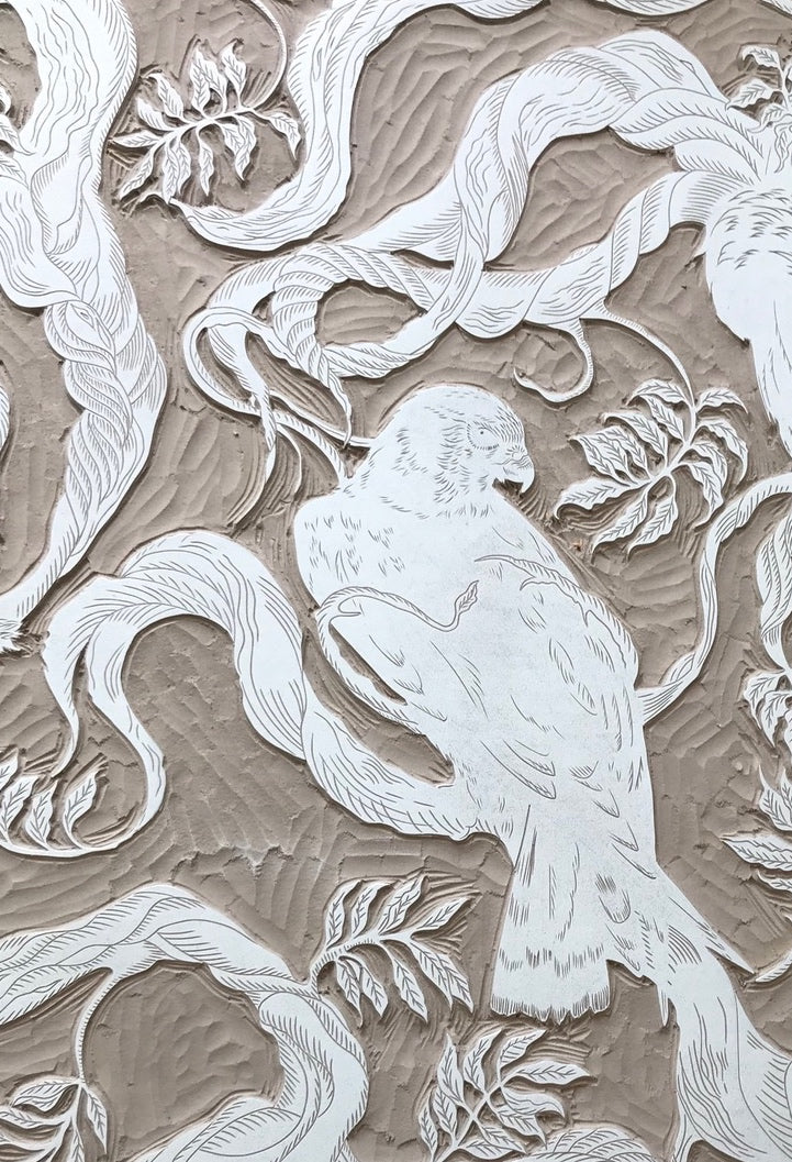 Each block was very large so as to be able to include fine detail, with only a section of the repeat being carved. The lino blocks were printed by hand on my press.