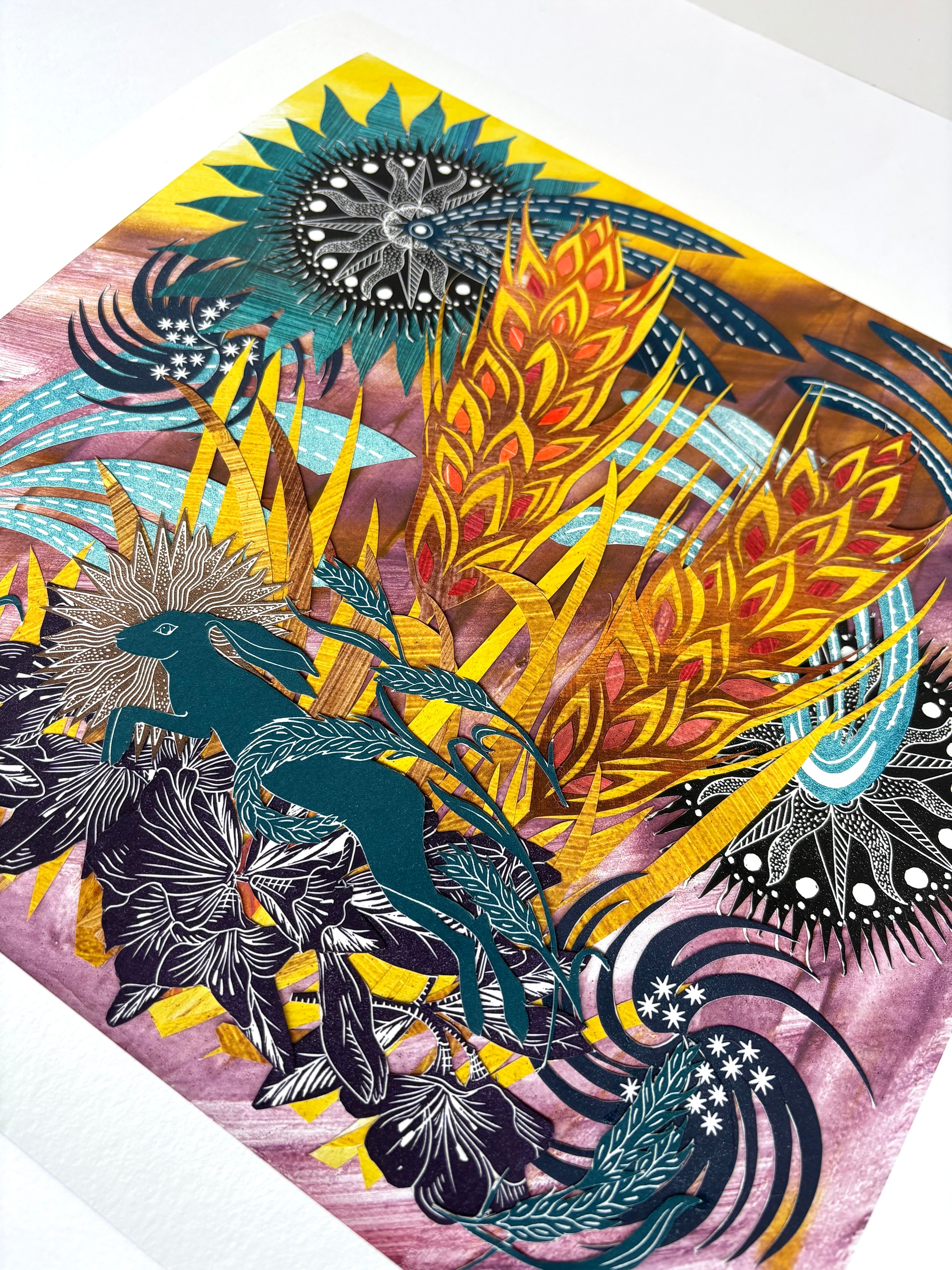 I work primarily within the medium of linocuts and collage, where I'm drawn to nature and mythology. I'm particularly interested in the folklore of Britain and Ireland (my heritage) and the symbolism of plants.