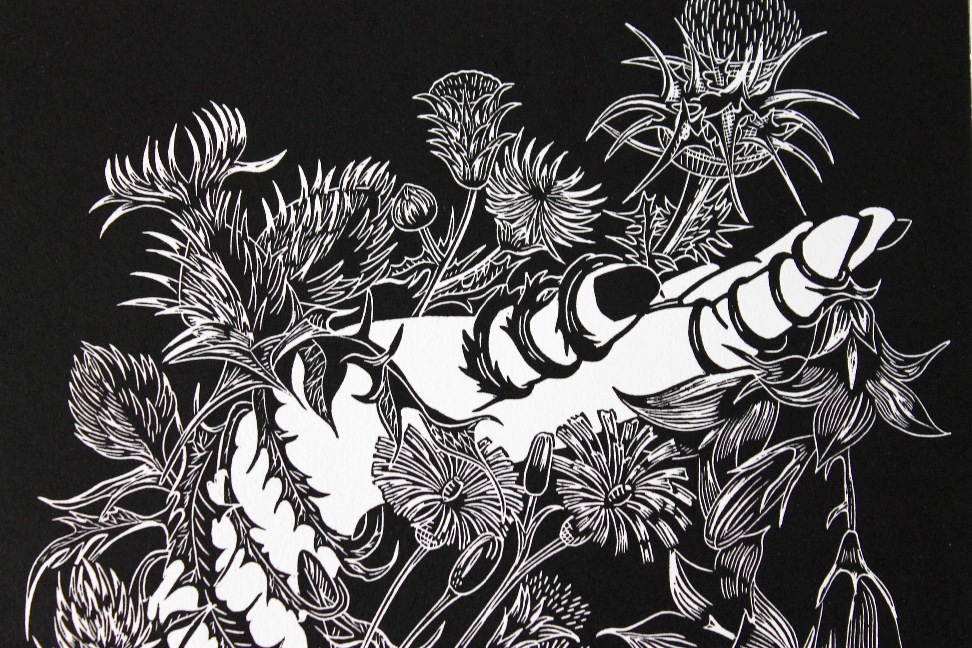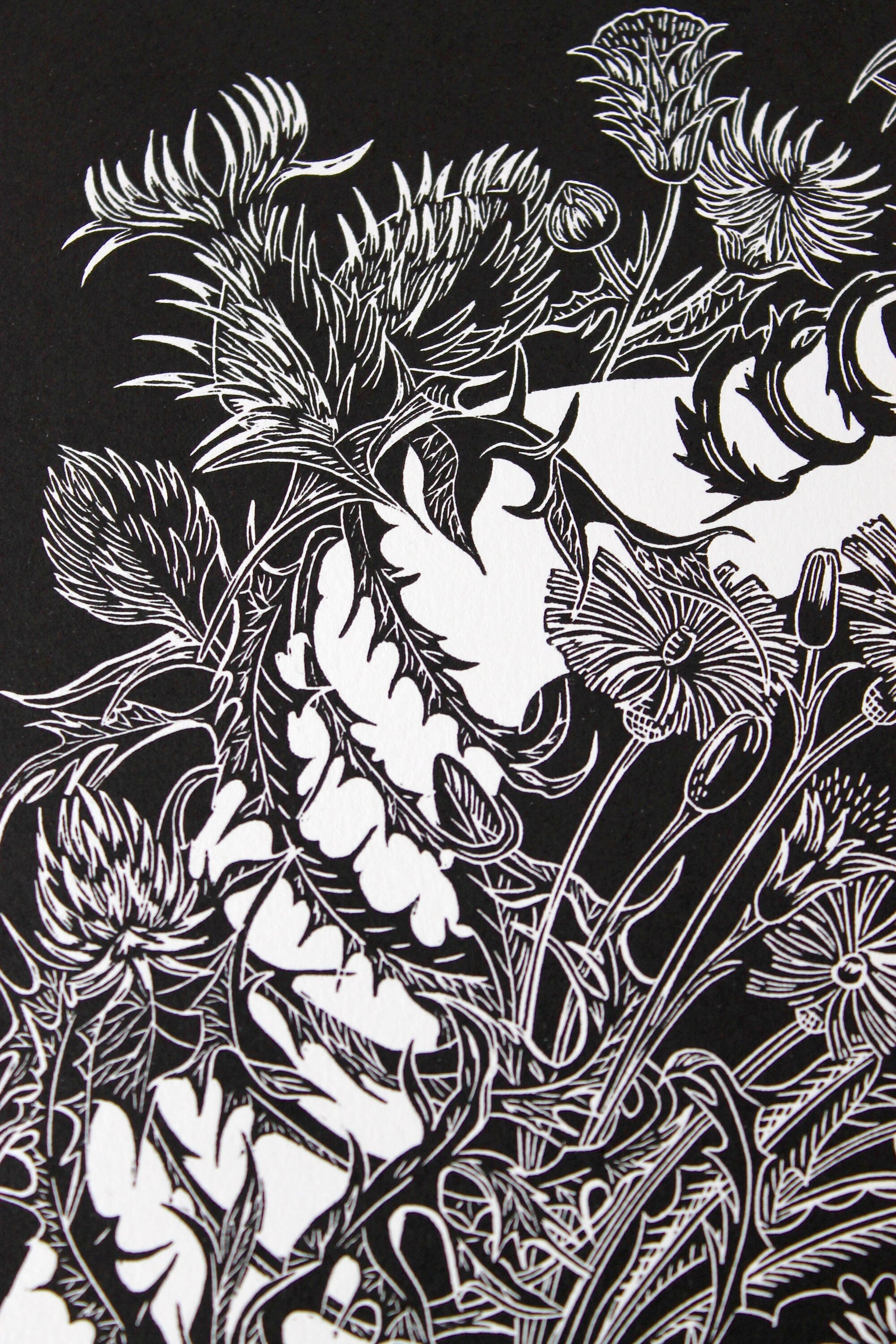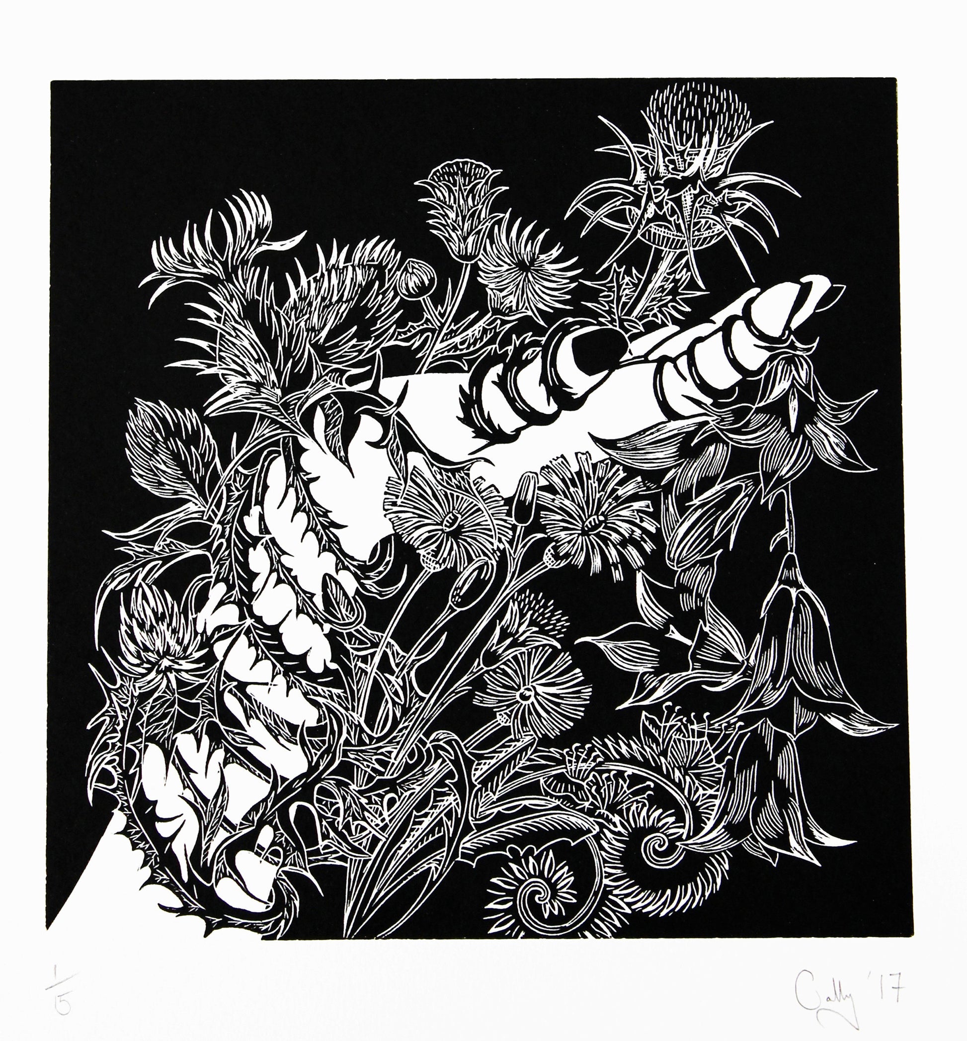 The title ‘Callieach Bheara’ alludes to the Scottish Folklore goddess, creator and destroyer. I wanted to symbolize our responsibility in the destruction and recovery of the Great Yellow Bumblebee’s natural habitat. I’ve included just some of the wildflowers found in Machair: Milk Thistle, Common Thistle, Spear Thistle, Catsear, Harebell, and Phacelia.