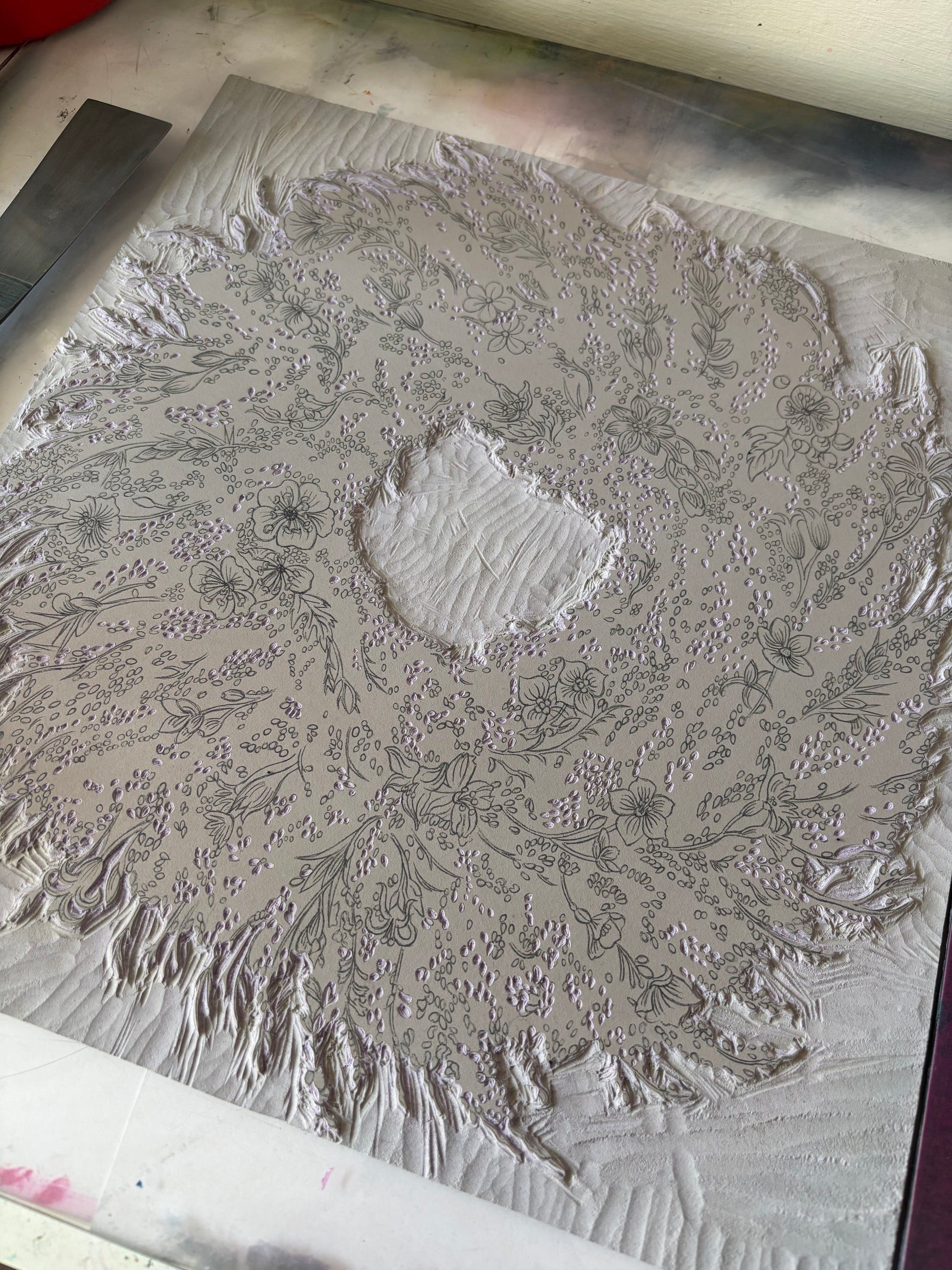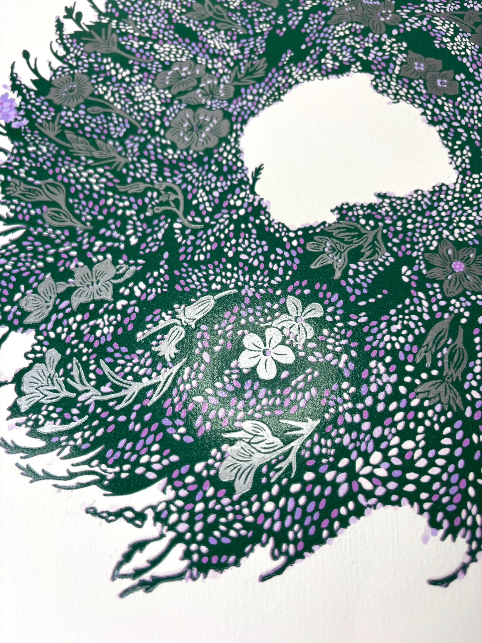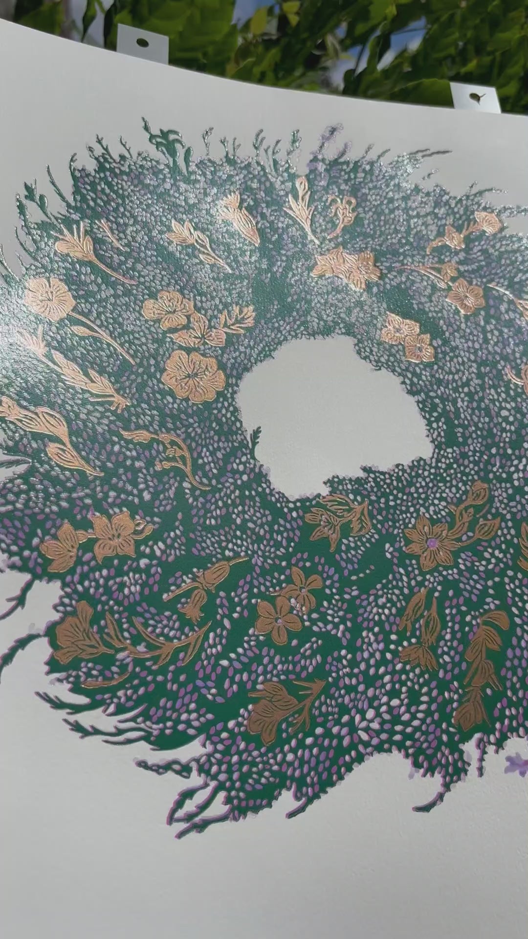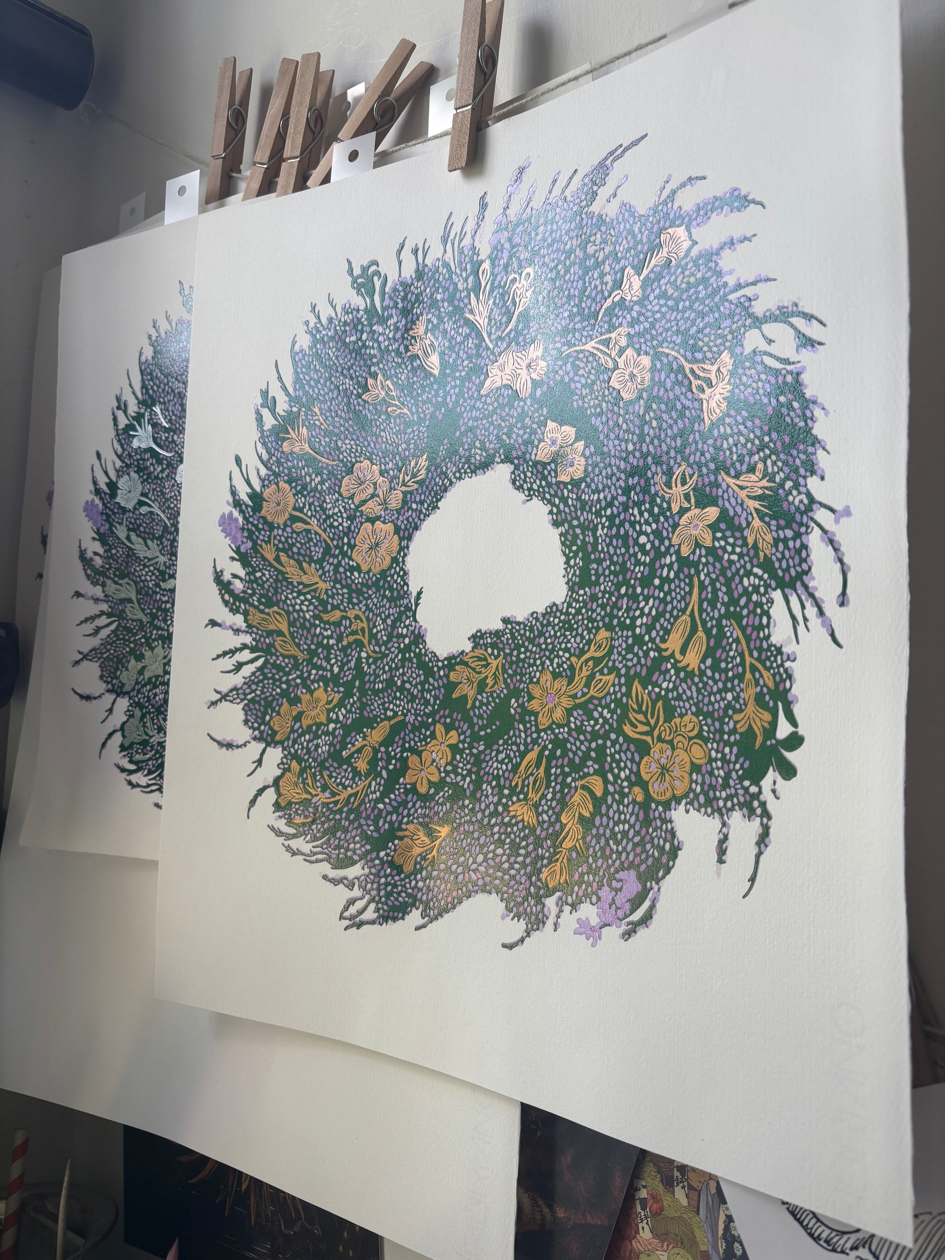 A six colour reduction linocut, with the final layer printed in metallic ink. One of my most ambitious prints to date due to its complexity, only 7 are available in either gold or silver. The final layer of metallic catches the light and shines in natural or ambient light.