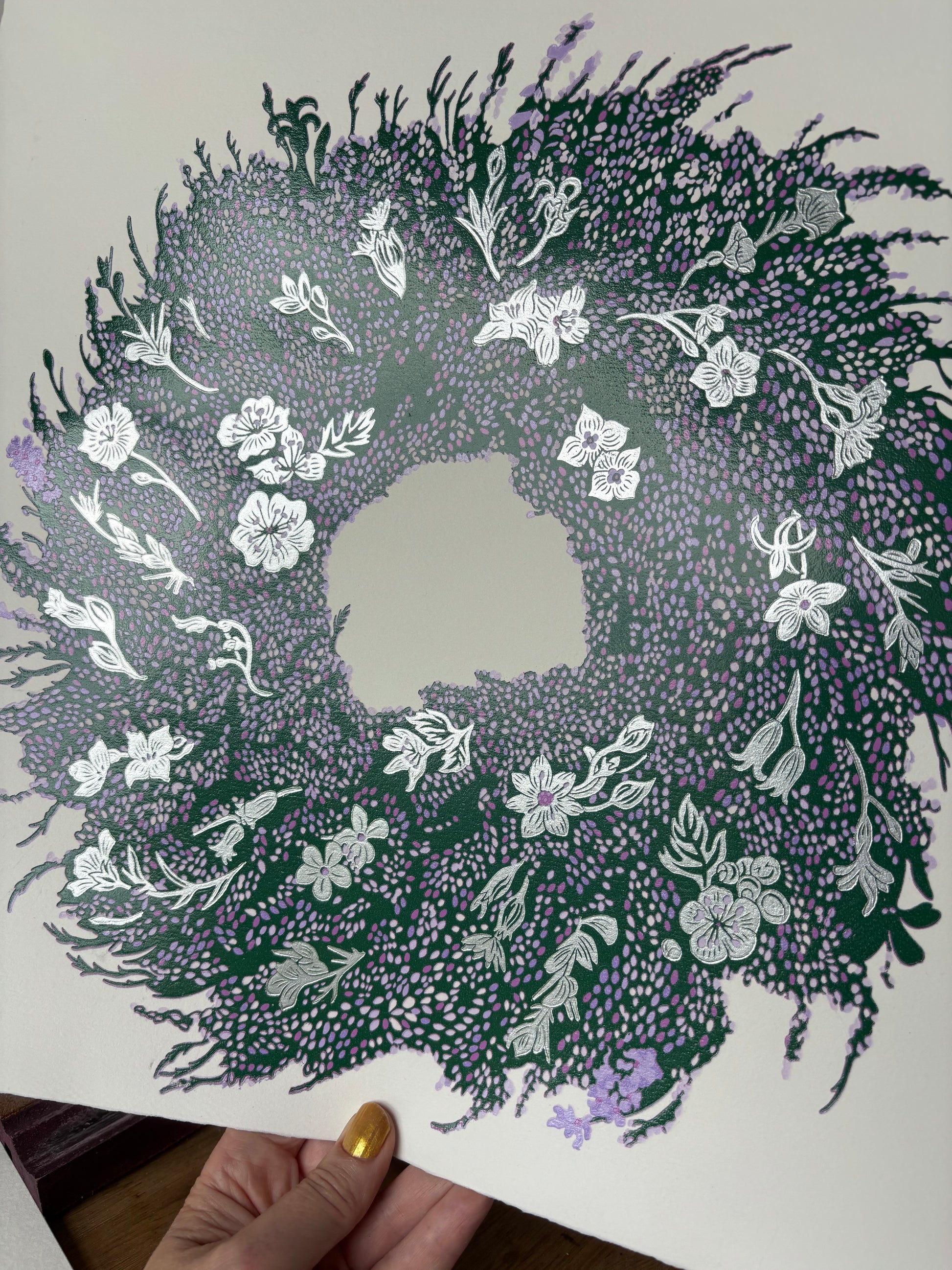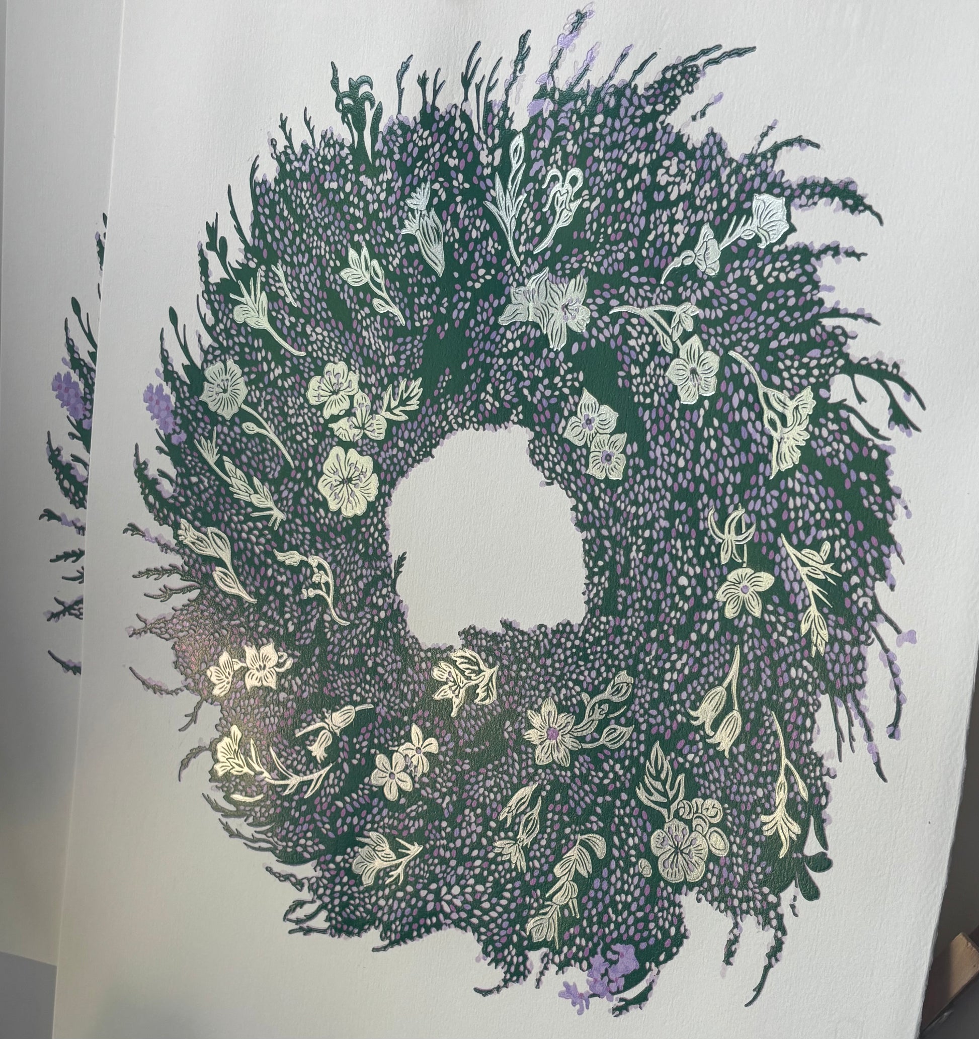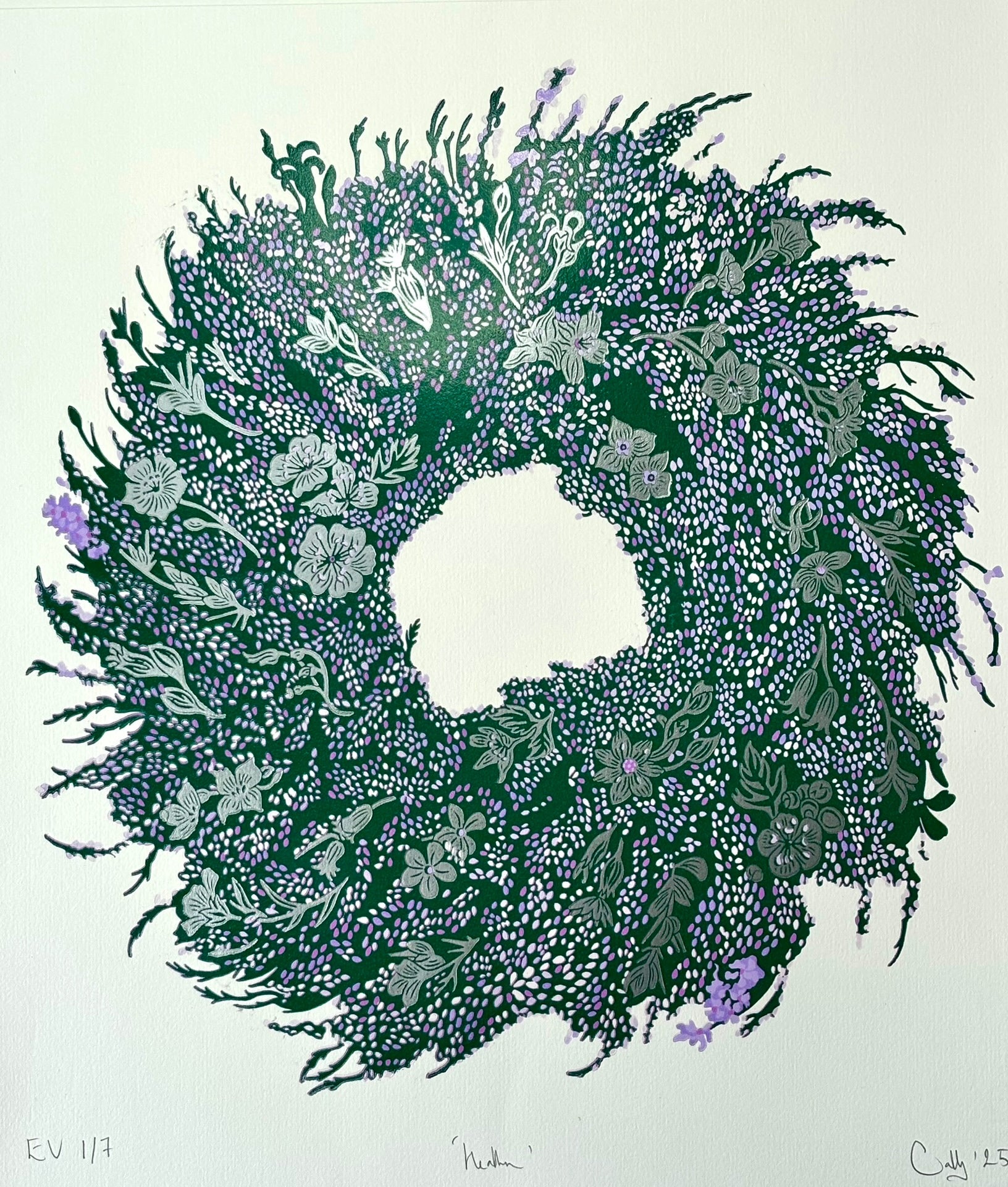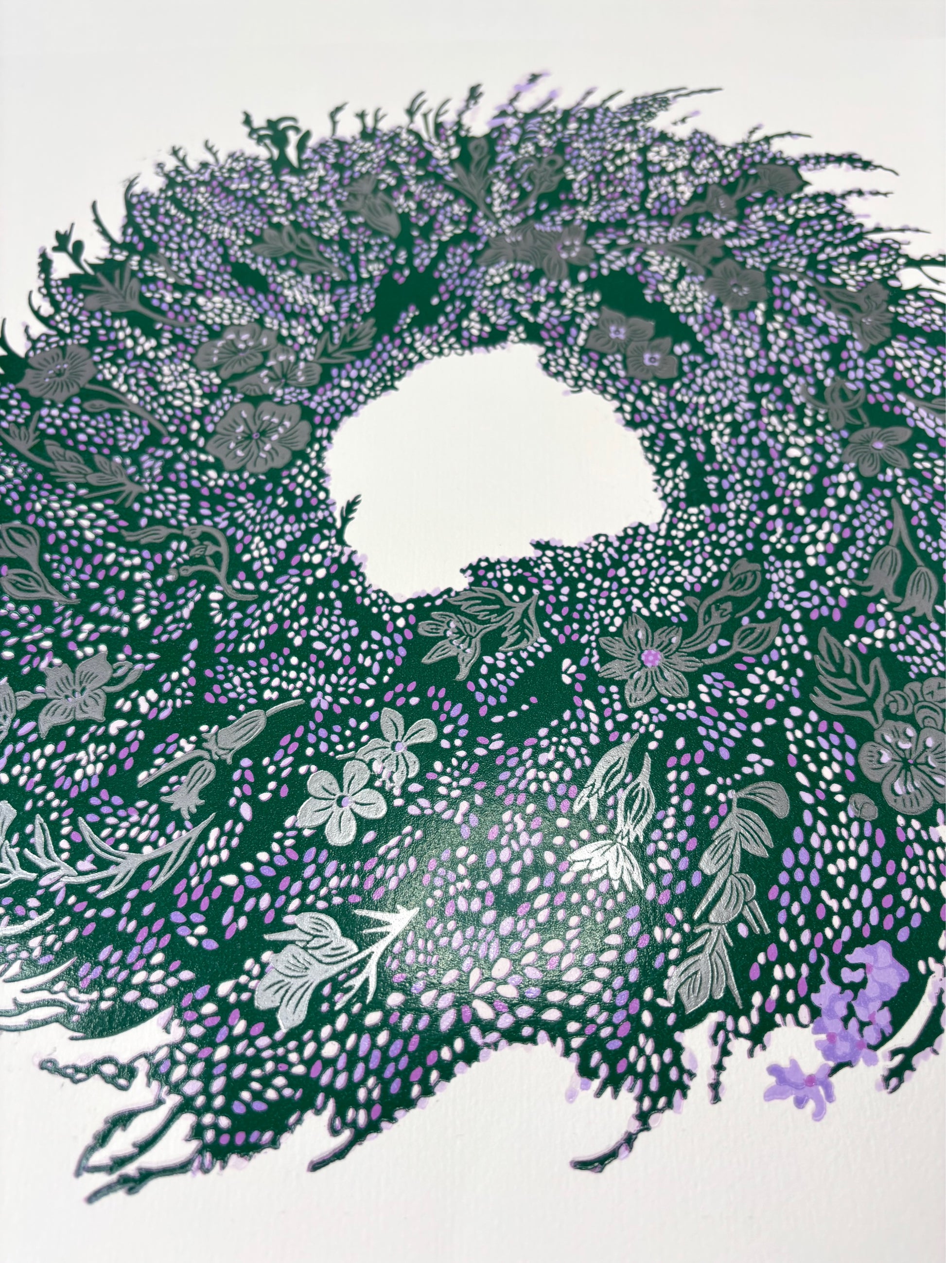 The Irish heather and wildflowers celebrates the connection to the land, of Ireland as a land rich with nature and folklore. The wildflowers depicted here are all are native to Ireland, which I researched extensively.