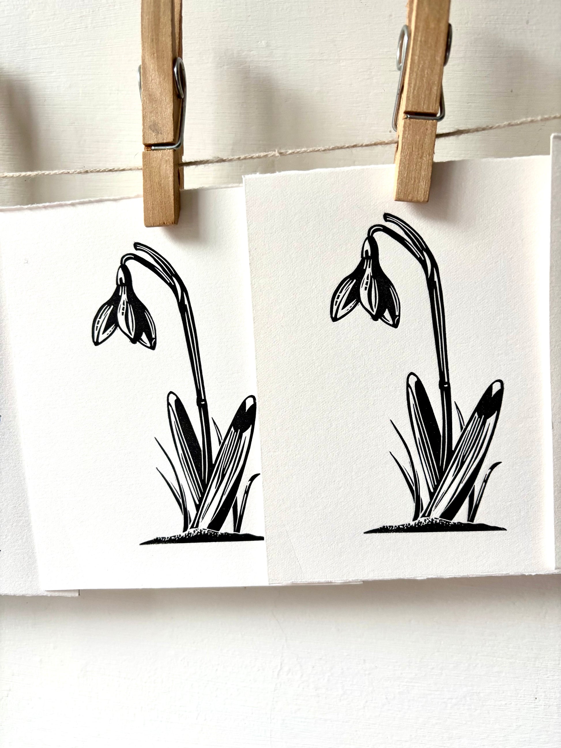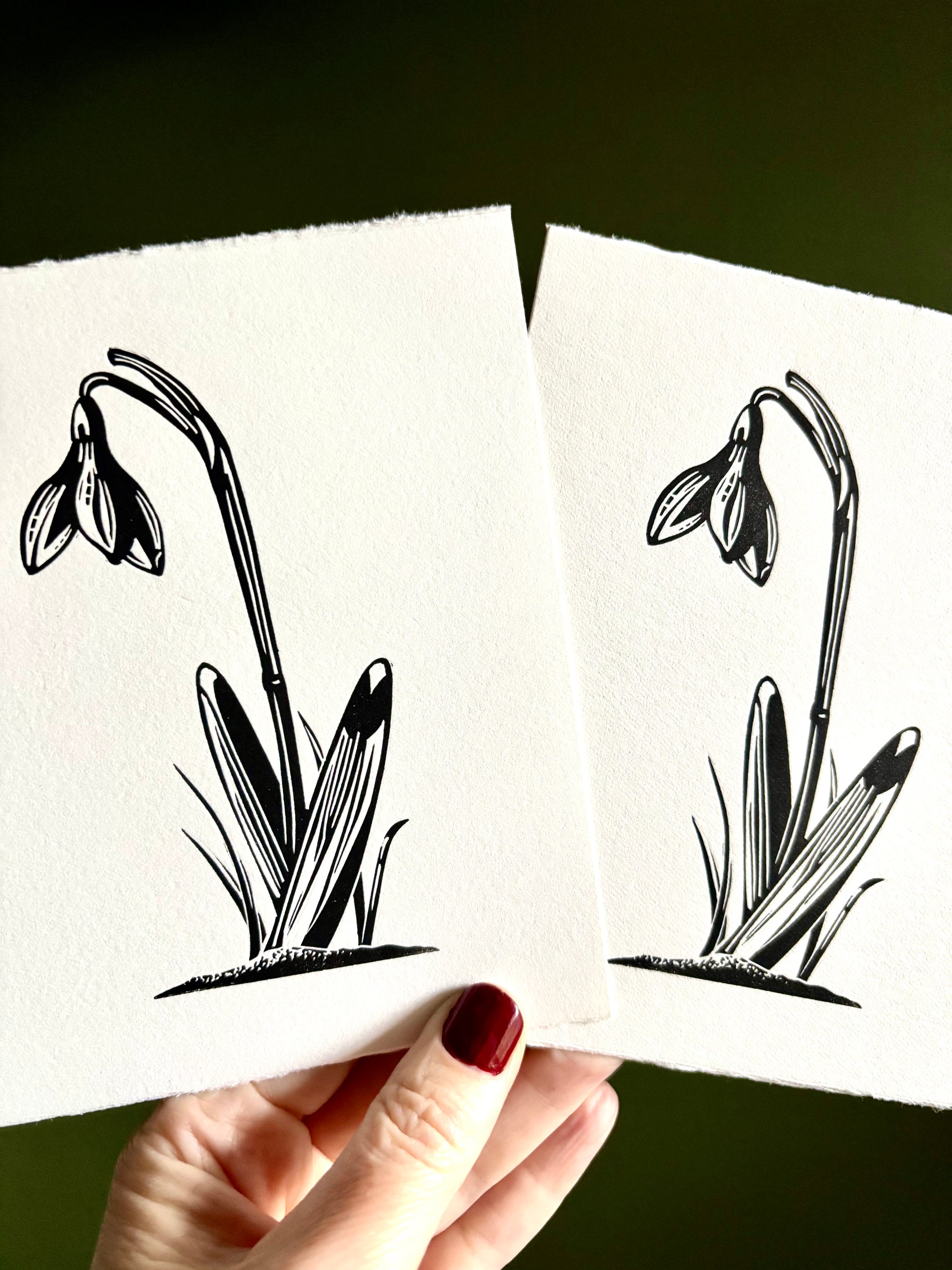 A handcarved linoprint, depicting a snowdrop flower to celebrate the Celtic festival of Imbolc.
