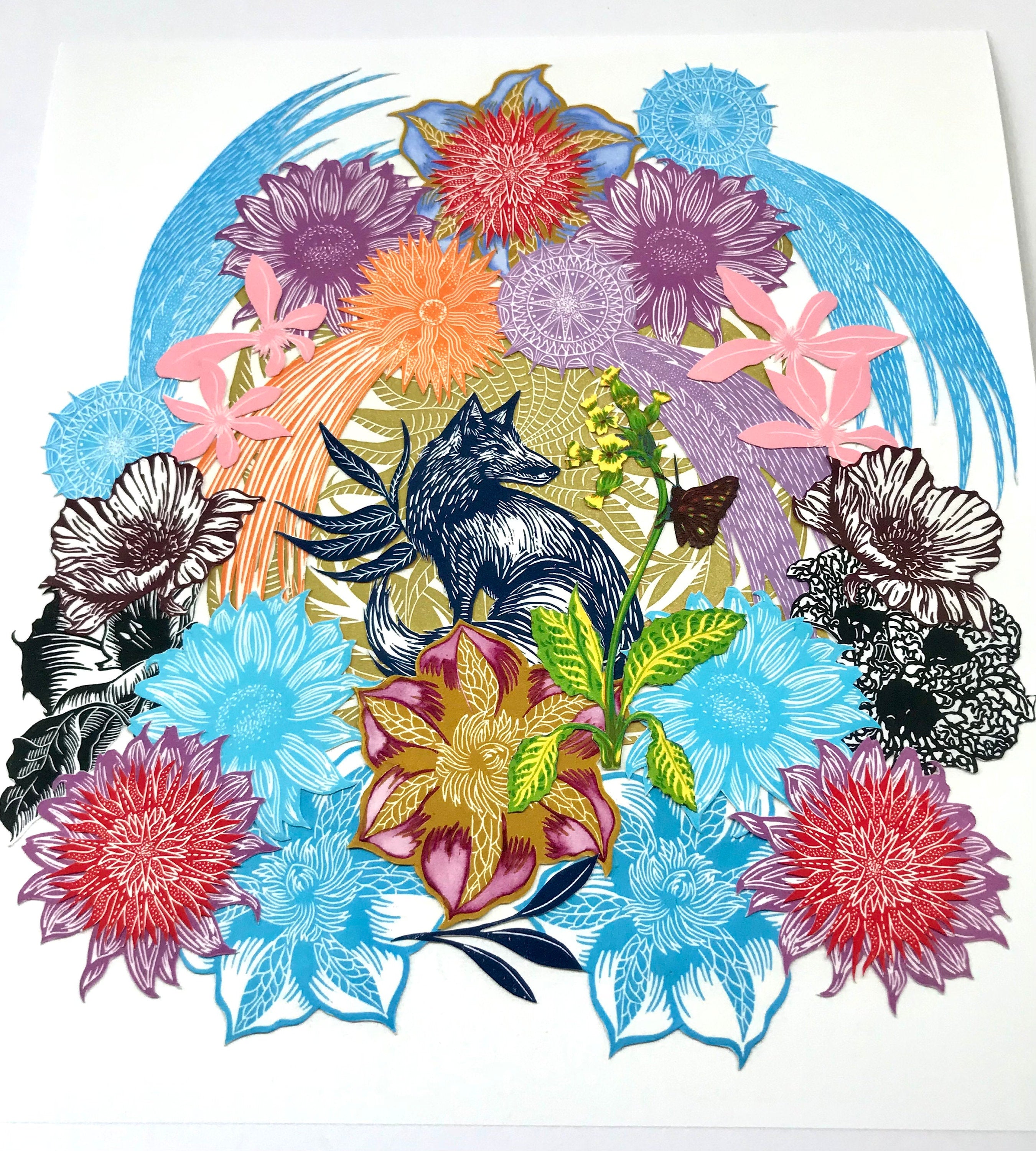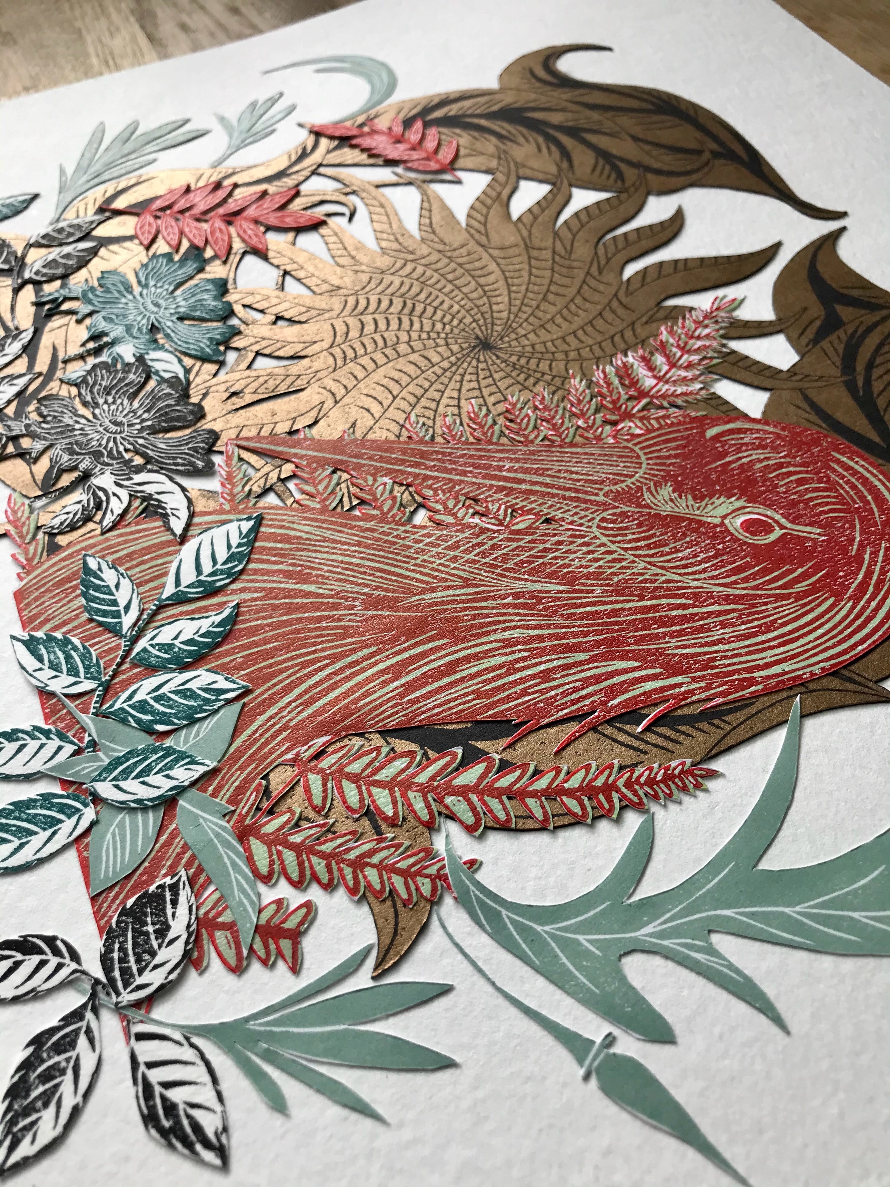 I work primarily within the medium of linocuts and collage, where I'm drawn to nature and mythology. I'm particularly interested in the folklore of Britain and Ireland (my heritage) and the symbolism of plants. My work also reflects an interest in ancient celestial events, Illuminated Manuscripts and medieval herbals, along with ancient texts such as the Book of Miracles. Pattern and decoration also features heavily, as I've a love for the decorative arts in all it's forms.